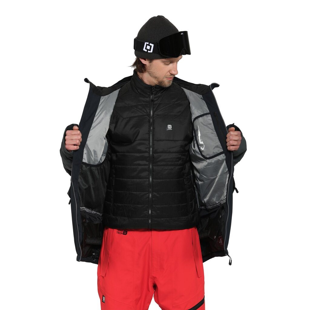 Insulated jacket designed for sports and outdoor activities, either as the main outer layer or as the third inner layer.